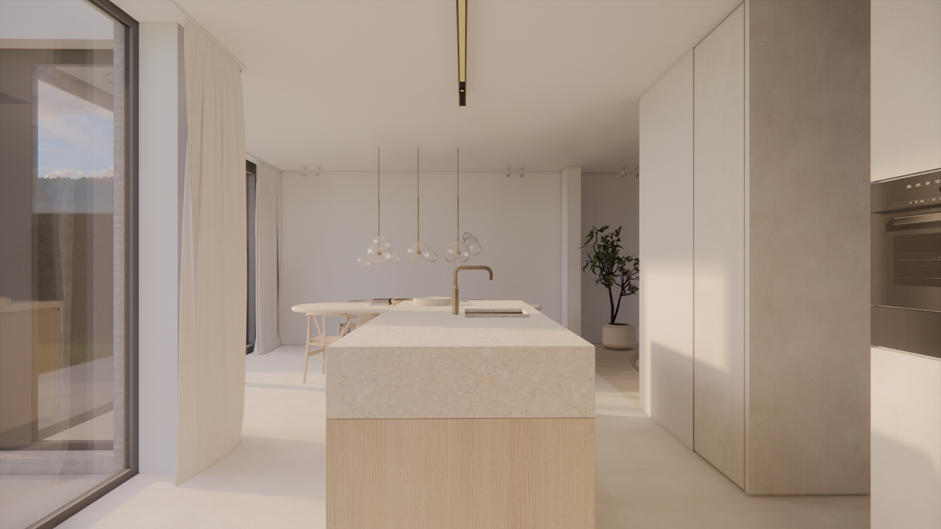 Een verfijnd detail dat dit ontwerp extra bijzonder maakt, is de dampkap, subtiel verwerkt in een elegante luifel met zachte afrondingen en verfijnde detaillering.