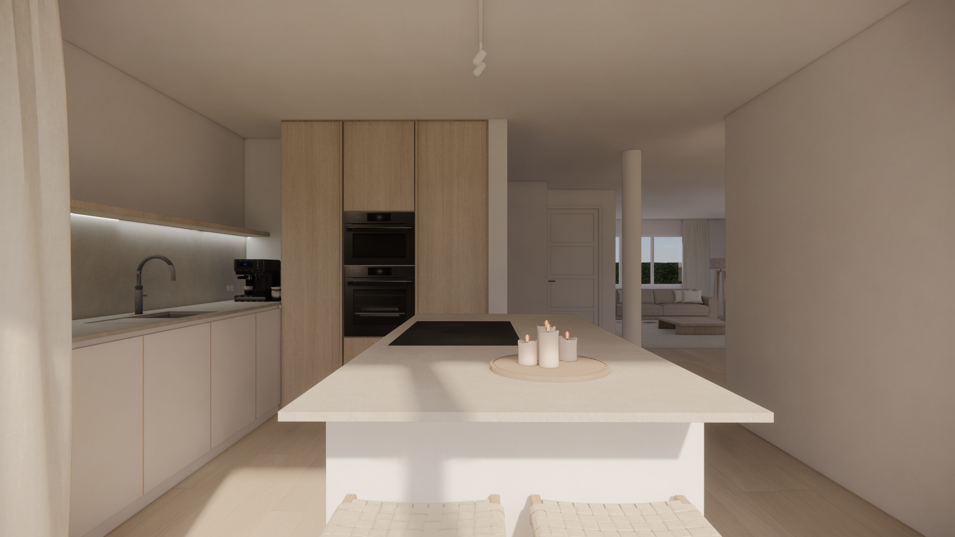 Met kasten voorzien van lichte eiken fronten krijgt de keuken een natuurlijke textuur en een warme uitstraling. Het strakke lichte beige werkblad, dat doorloopt in zowel het eiland als de achterwand, creëert een harmonieus geheel en een gevoel van ruimte. Een fijne toevoeging is de houten fineerplank boven het aanrecht, die zorgt voor een subtiele verbinding tussen de materialen en een verfijnd detail toevoegt.