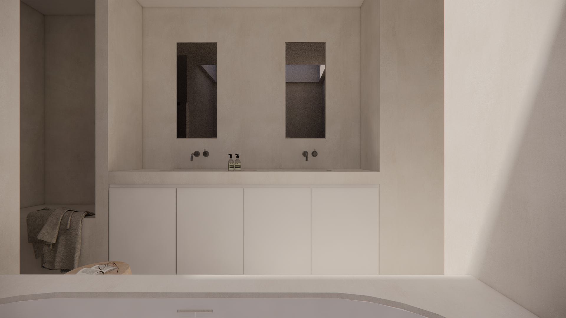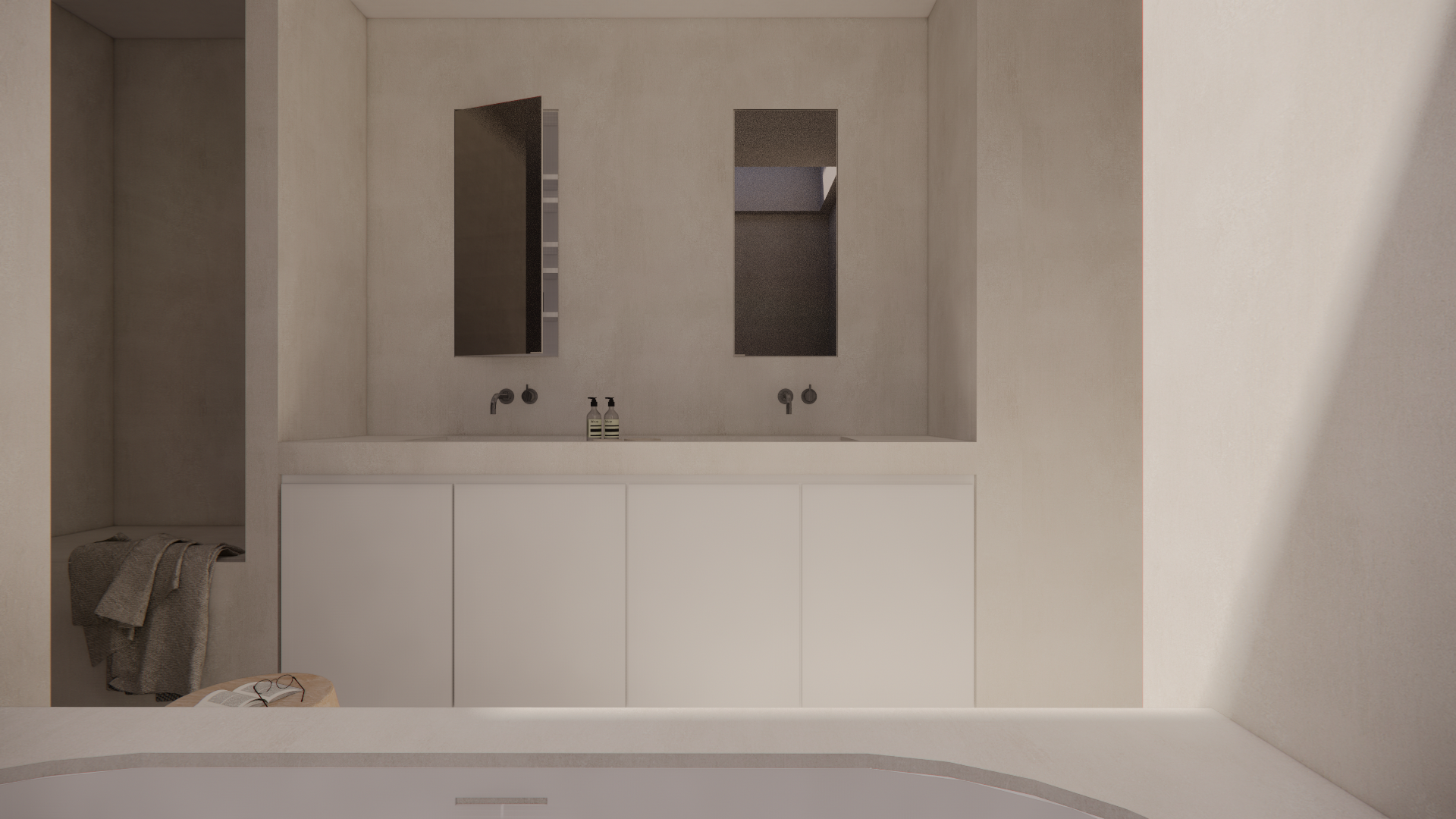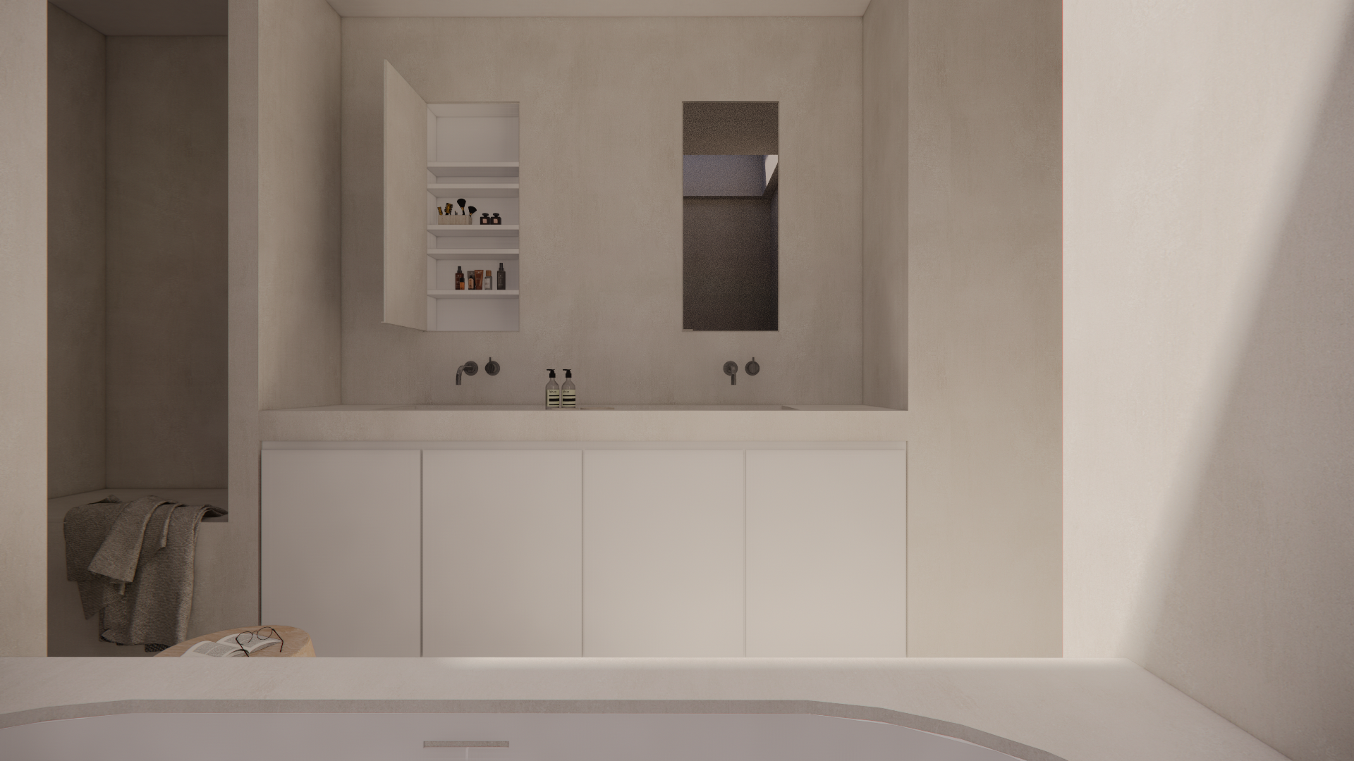 Ook de badkamer belichaamt de balans tussen strak design en functionaliteit. Slim weggewerkte opbergruimte achter de spiegels zorgt ervoor dat verzorgingsproducten netjes uit het zicht blijven, terwijl de ruimte zelf rust en organisatie uitstraalt. Dit slimme systeem maakt van de badkamer een serene en opgeruimde plek, zonder in te leveren op stijl.