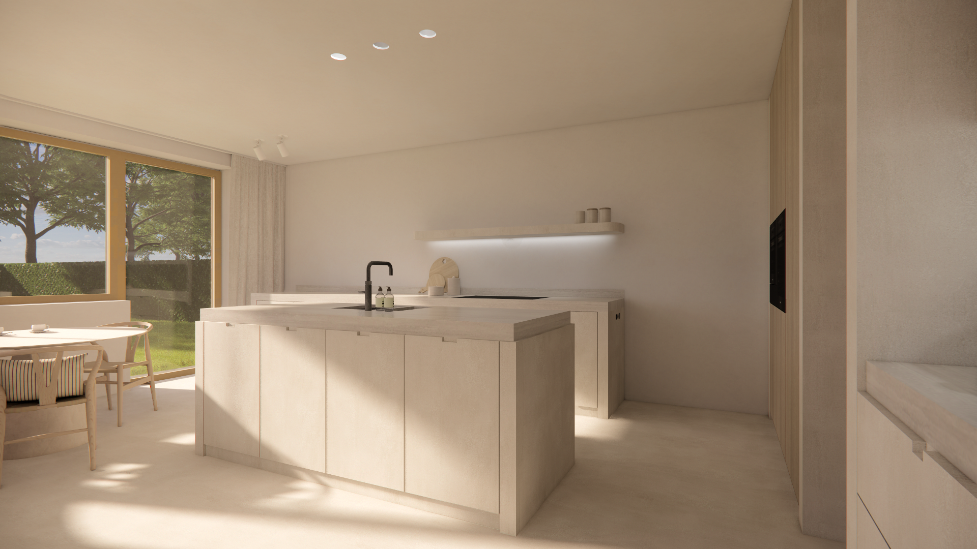 In de keuken draait alles om strakke lijnen en slimme oplossingen. Een bijzonder element is de blinde deur die moeiteloos toegang biedt tot de extra opbergruimte en de achterinkom. Deze deur is volledig geïntegreerd in het ontwerp en uitgevoerd in dezelfde materialen en kleuren als de keuken, waardoor ze onzichtbaar wordt en de serene uitstraling intact blijft.