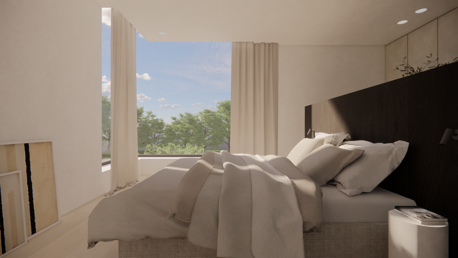 De mastersuite vormt het absolute pronkstuk van de verdieping. Ruim, maar tot in detail doordacht en voorzien van alle functies. Het opvallende beddenhoofd speelt hierin een sleutelrol: niet alleen een stijlvol element, maar ook functioneel. Aan de achterzijde is het geïntegreerd in de dressing, waardoor de ruimte niet alleen mooi maar ook slim is ingericht. Luxe en functionaliteit smelten hier naadloos samen.