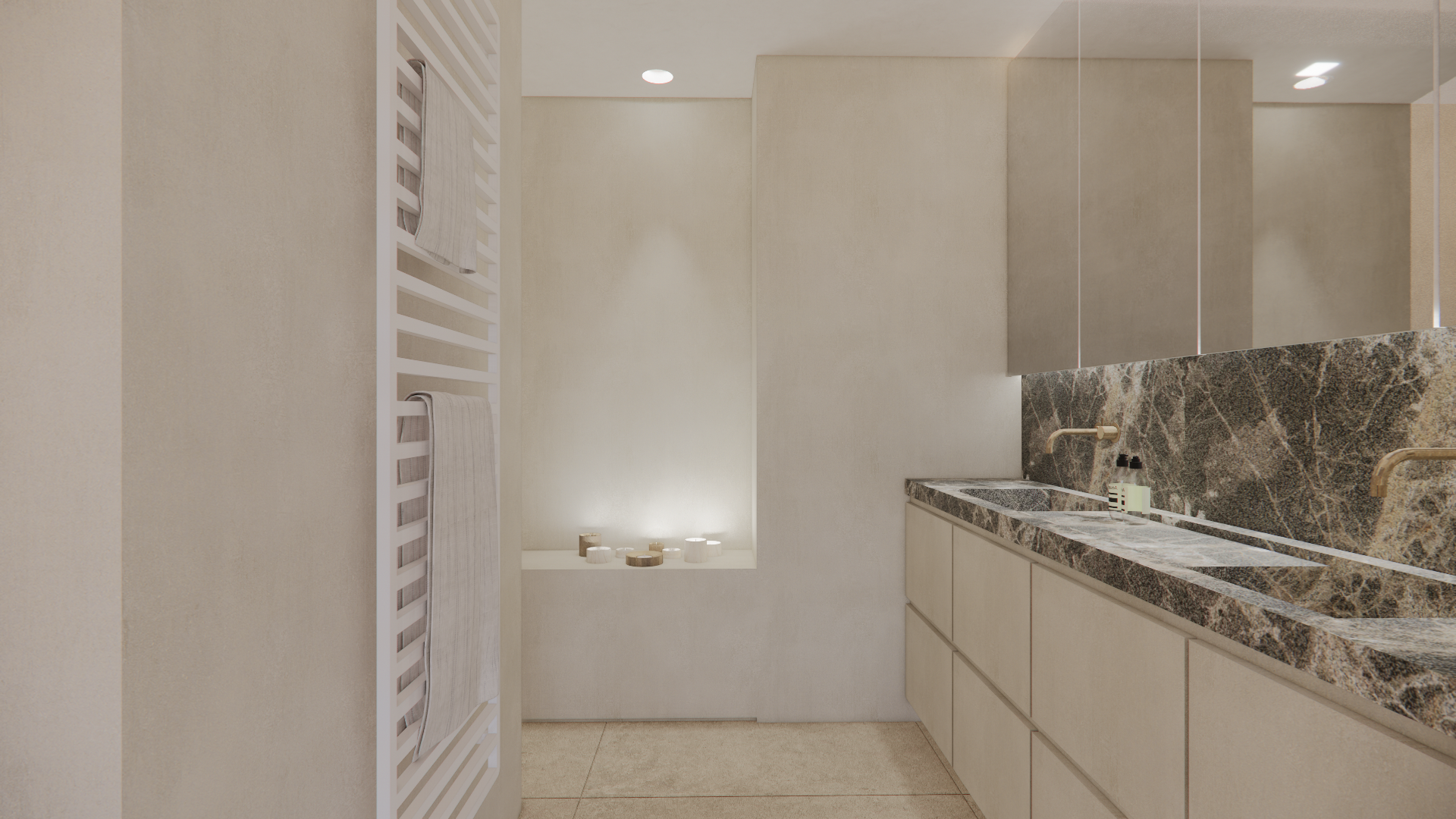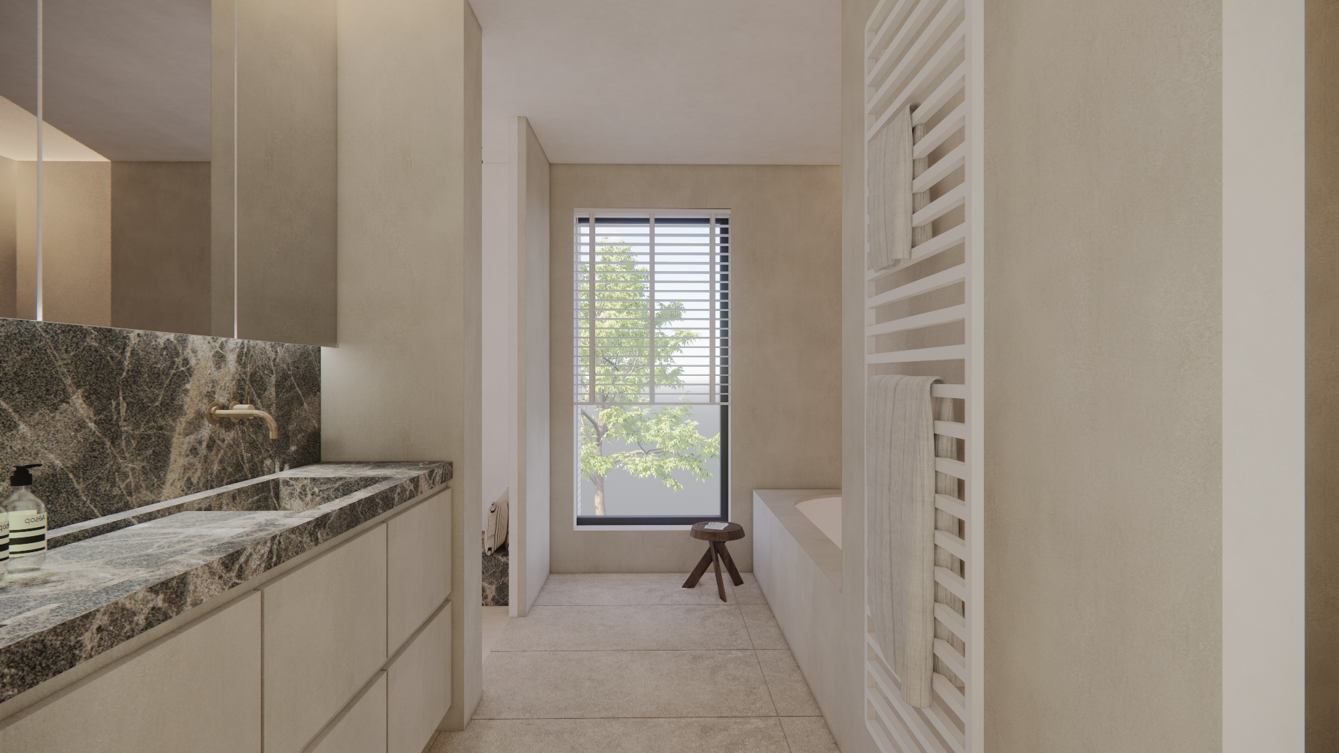 De aangrenzende badkamer is een plek van pure verfijning en ontspanning. De natuursteen, die ook op de benedenverdieping is gebruikt, komt hier elegant terug, gecombineerd met een naadloze microtopping afwerking voor een eigentijdse, strakke look. De douche is voorzien van een comfortabele zitbank en discreet geplaatst achter een wand in plaats van glas, wat zorgt voor meer privacy en een rustgevende sfeer.