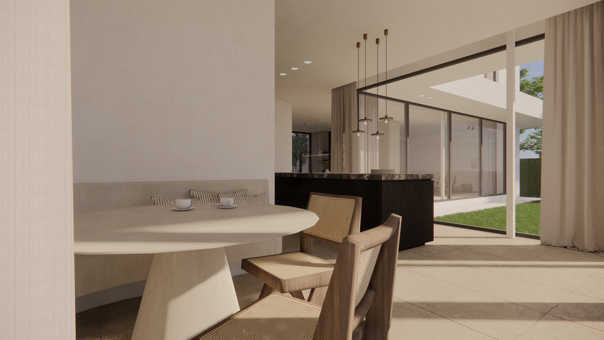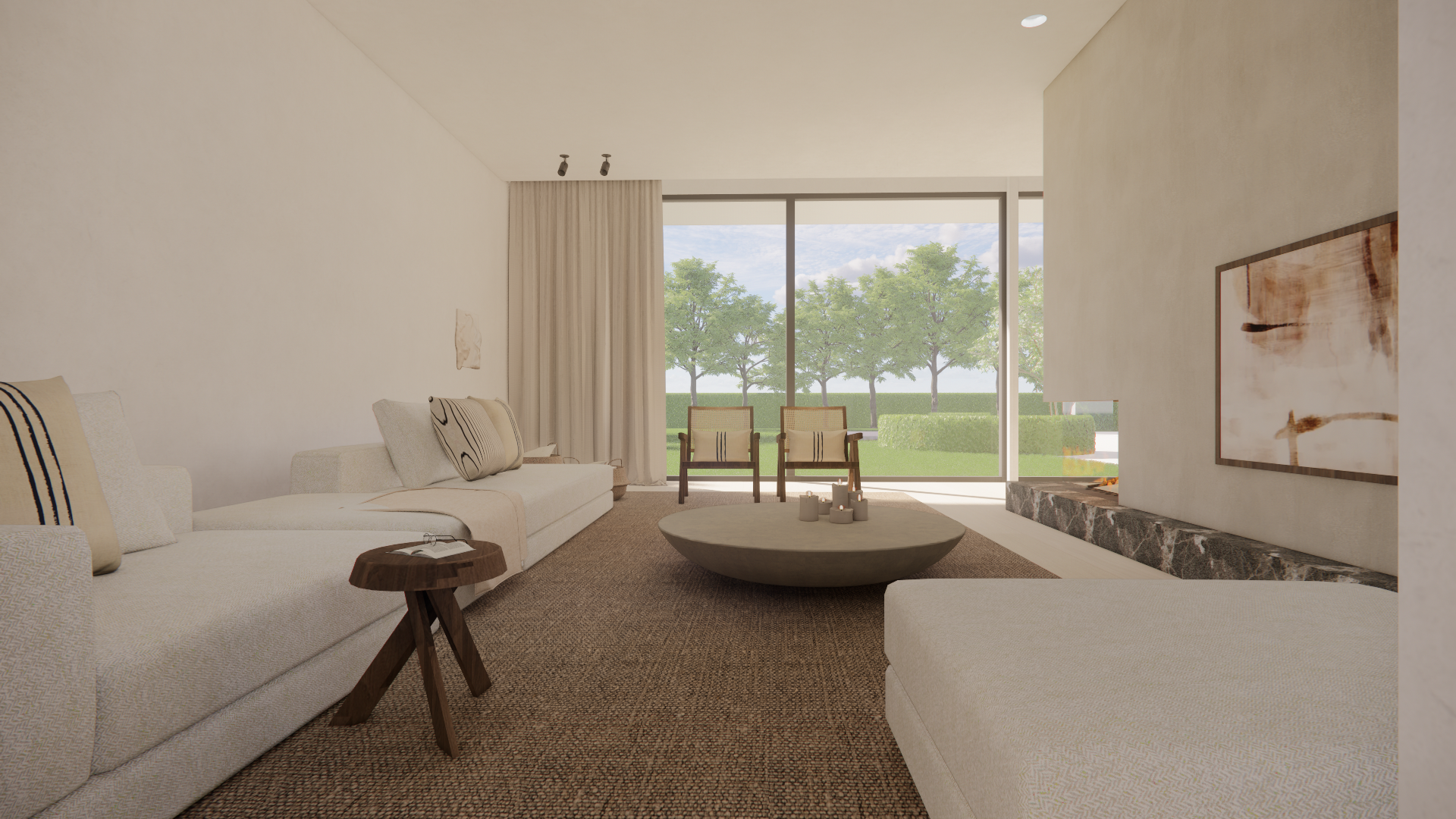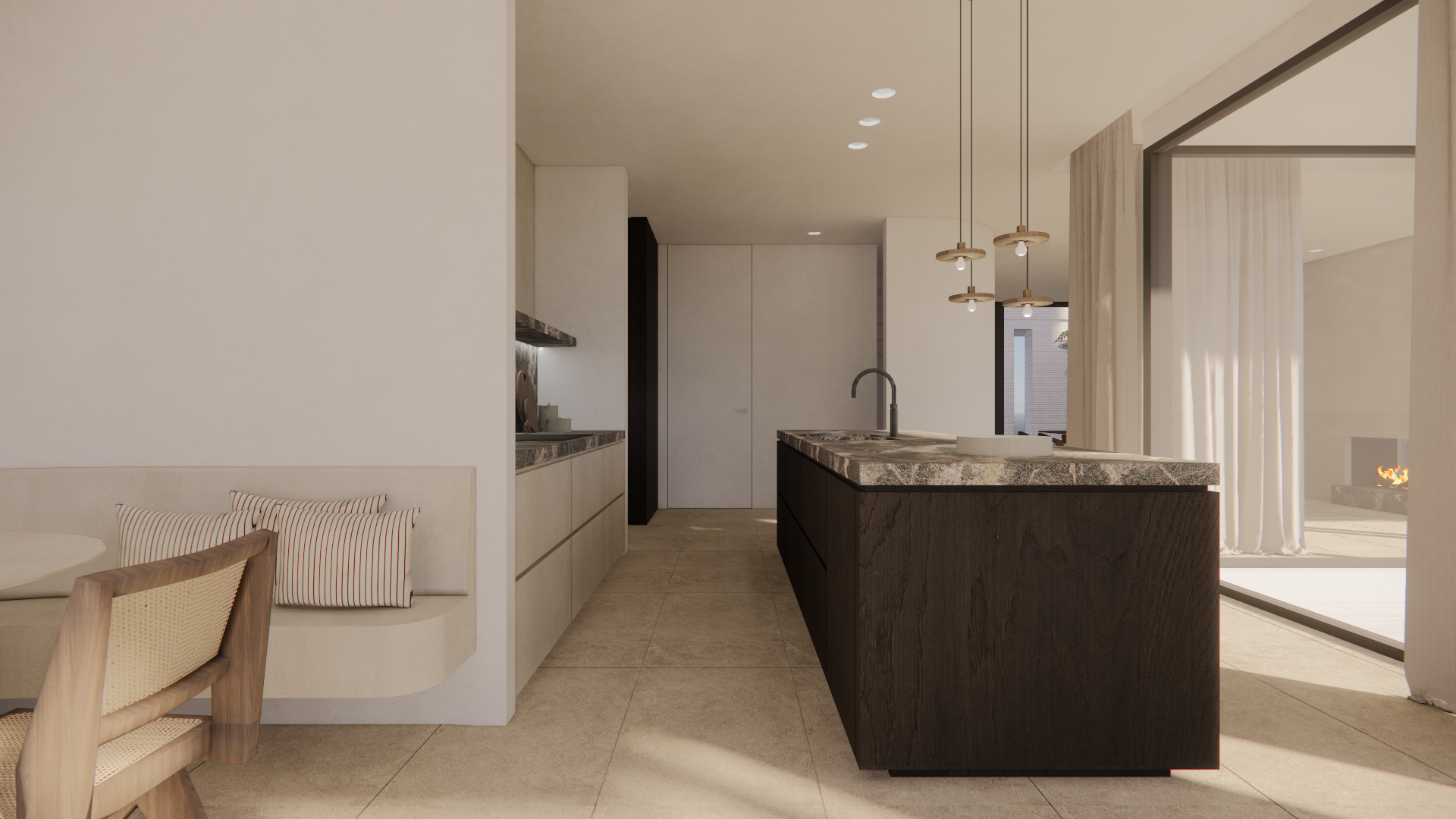 Het volledige ontwerp ademt gezelligheid en verbinding. De open haard vormt het warme hart van de woonkamer, terwijl het zachte licht en de natuurlijke tinten een ontspannen sfeer creëren. Aan de ruime eettafel is volop plek voor lange avonden vol gesprekken en mooie herinneringen. Een interieur waar je je direct thuis voelt, elke dag opnieuw.
