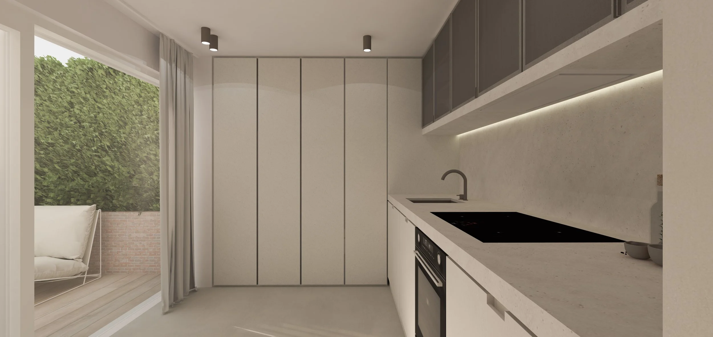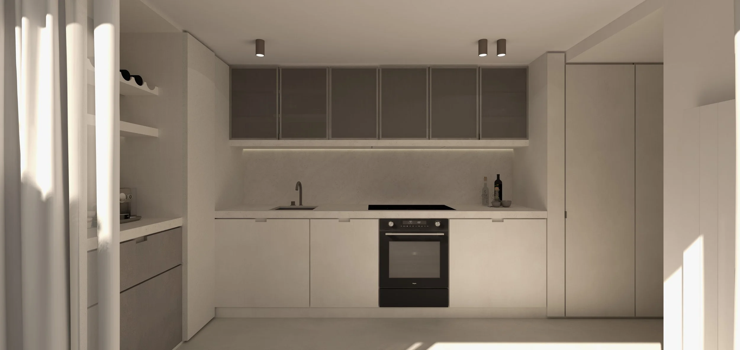 De keuken biedt een open kast als ontbijtkast, een perfecte plek om de dag te beginnen met een kopje koffie. De koffiehoek vormt het hart van de ruimte, en komt op vrijdagavond tot leven als wijnbar. Dit multifunctionele element maakt de ruimte extra dynamisch en flexibel, aangepast aan de behoeften van de bewoners. Deze zone kan ook volledig afgesloten worden met de bijzondere 180 graden scharnierende fronten, zodat je de ruimte kunt aanpassen aan je wensen. Het aanrechtblad is voorzien van natuursteen, wat niet alleen zorgt voor een luxe uitstraling, maar ook doorloopt naar de achterwand en als een subtiel detail onder de stalen glazen bovenkasten.