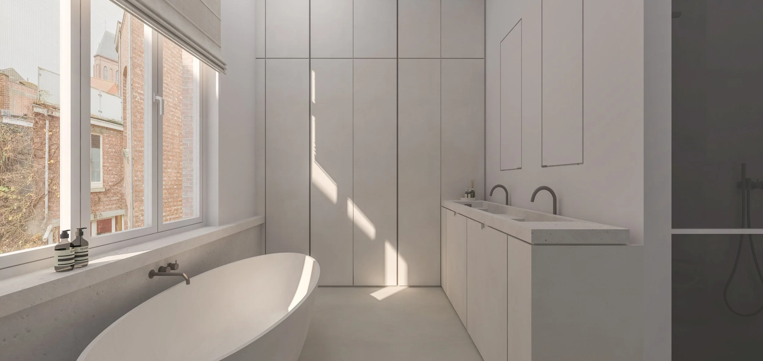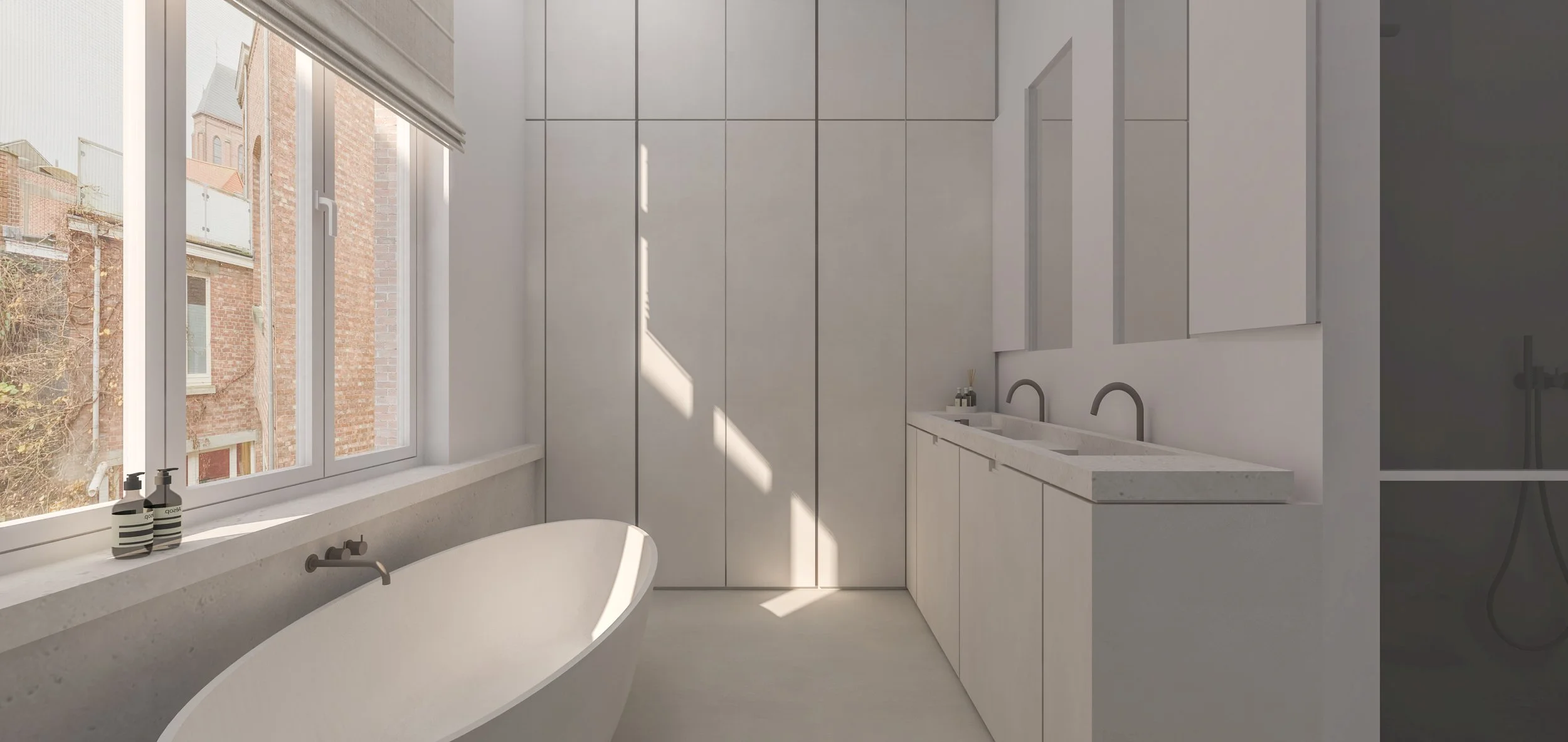 In de badkamer zien we een voortzetting van het gebruik van natuursteen, met een indrukwekkende voorzetwand die het inbouwkraanwerk bevat en een mooi detail creëert over de gehele wand, zelfs onder het raam bij de vrijstaande badkraan. De grote kastenwand biedt voldoende opbergruimte, zodat de ruimte georganiseerd en opgeruimd blijft. Het wastafelmeubel is niet alleen praktisch, maar ook esthetisch een statement, met verfijnde details en spiegels die subtiel verborgen zijn achter een front voor een rustige, serene sfeer. De vrijstaande douche met een glas-stalen douchewand zorgt voor een open en luxe gevoel, perfect passend bij het geheel van de ruimte.