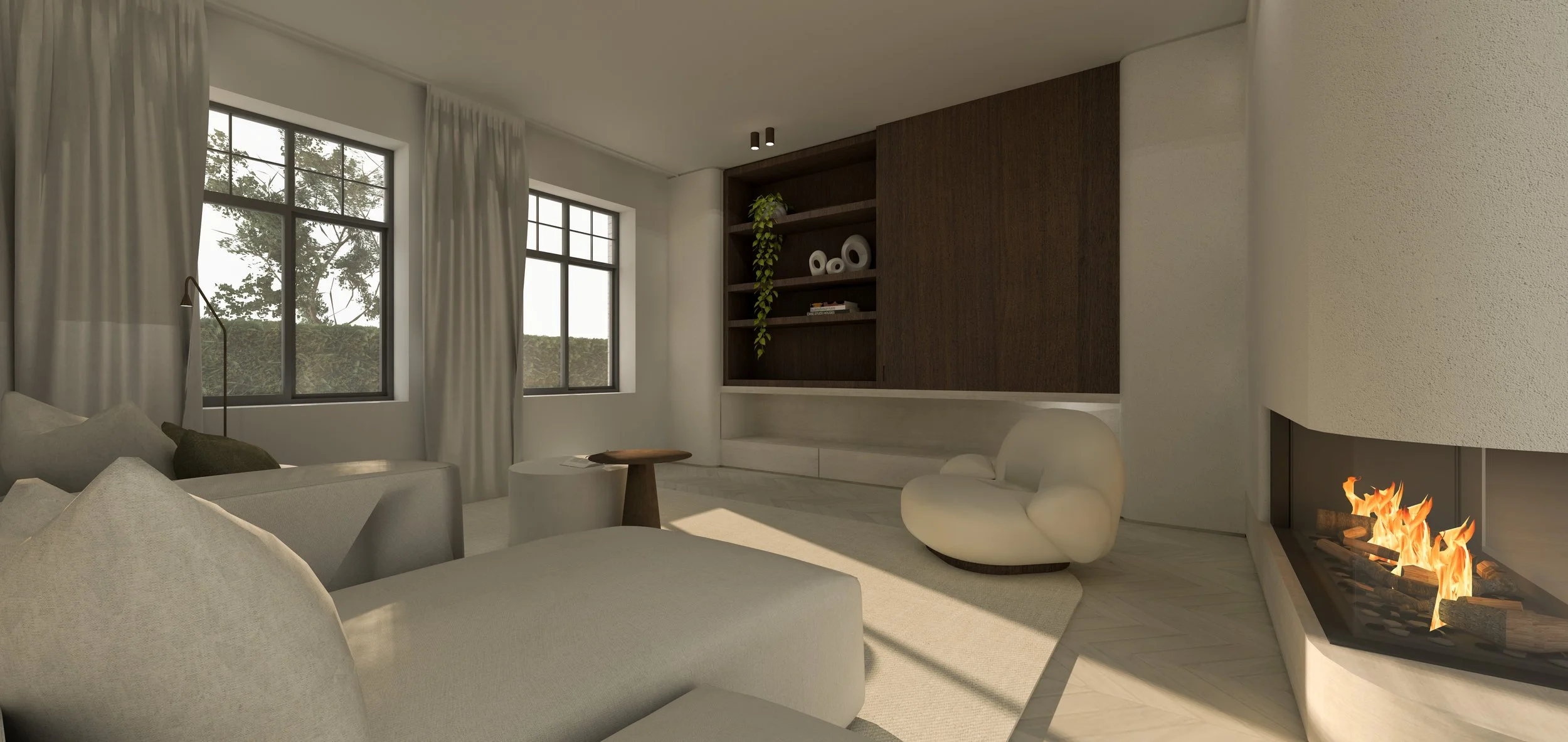 Daarnaast hebben we een haardmeubel ontworpen met een ingebouwde gashaard die warmte en sfeer brengt. De ronde vormen van het meubel versterken het harmonieus geheel, terwijl de materialen en kleuren zorgvuldig zijn afgestemd op de rest van het interieur. Dit project is een perfect voorbeeld van hoe functionaliteit en design hand in hand gaan.